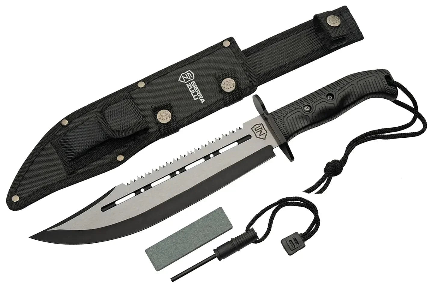 The BLACKTALON S5 is a 10.5-inch fixed blade knife engineered for serious survival. With a clip point edge, serrated spine, and non-slip tactical grip, it’s built for fieldwork in any environment. Includes a fire starter and compact sharpener, stored in a secure hard sheath for reliable belt carry.