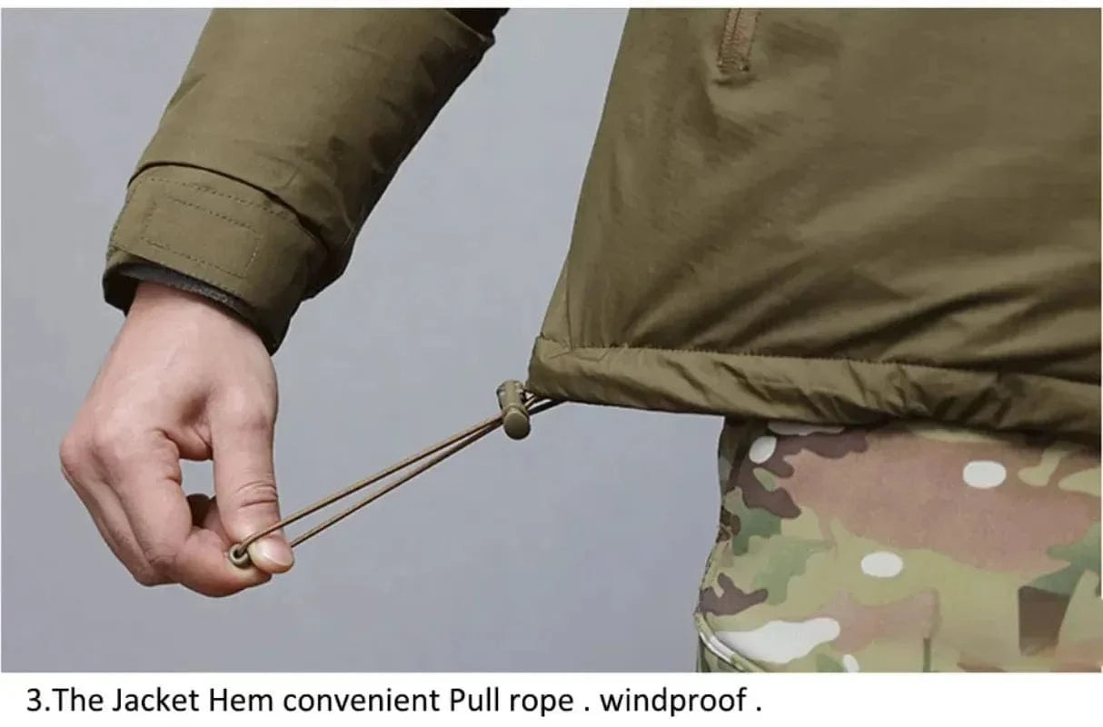Lined with thermal cotton insulation and protected by a windproof, water-resistant outer shell, this parka is built for maximum heat retention, zero thermal loss, and full gear-layer integration. Designed for military deployment, arctic recon, or long-term off-grid exposure, the L7 features a helmet-compatible hood, wool-lined interior zones, and 1000g weight for full-body defense in hostile climates.